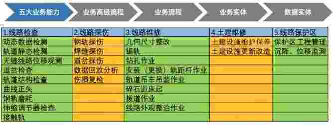 在轨道运维业务中,,,,我们形成了完整的从业务能力(业务域)-业务流程-业务实体-数据模型的分析梳理过程。。。。轨道运维业务能力如下图所示:::