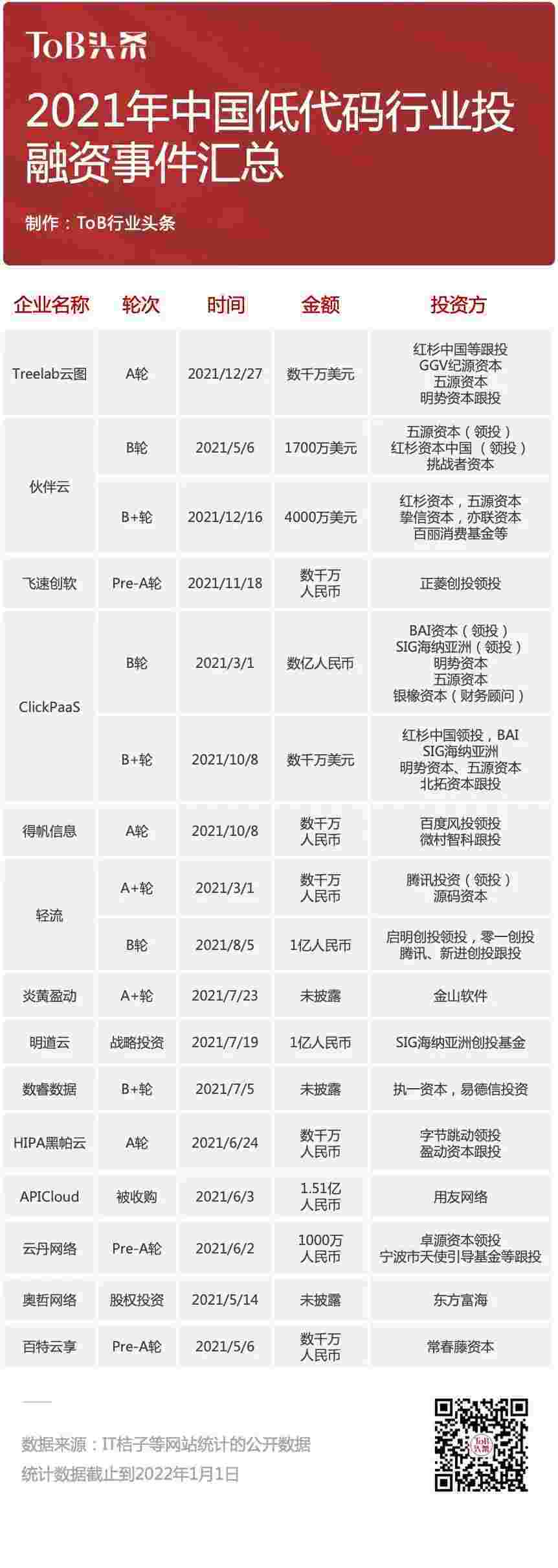 到2021年,,,,无/低代码投融资规模势头更甚,,,其中包括轻流两轮融资(A+轮数千万人民币,,B轮近亿人民币)、、、、NO钱包 两轮融资(B轮数亿人民币,,,,B+轮数千万美元)、、百特云享数千万元Pre-A轮融资......